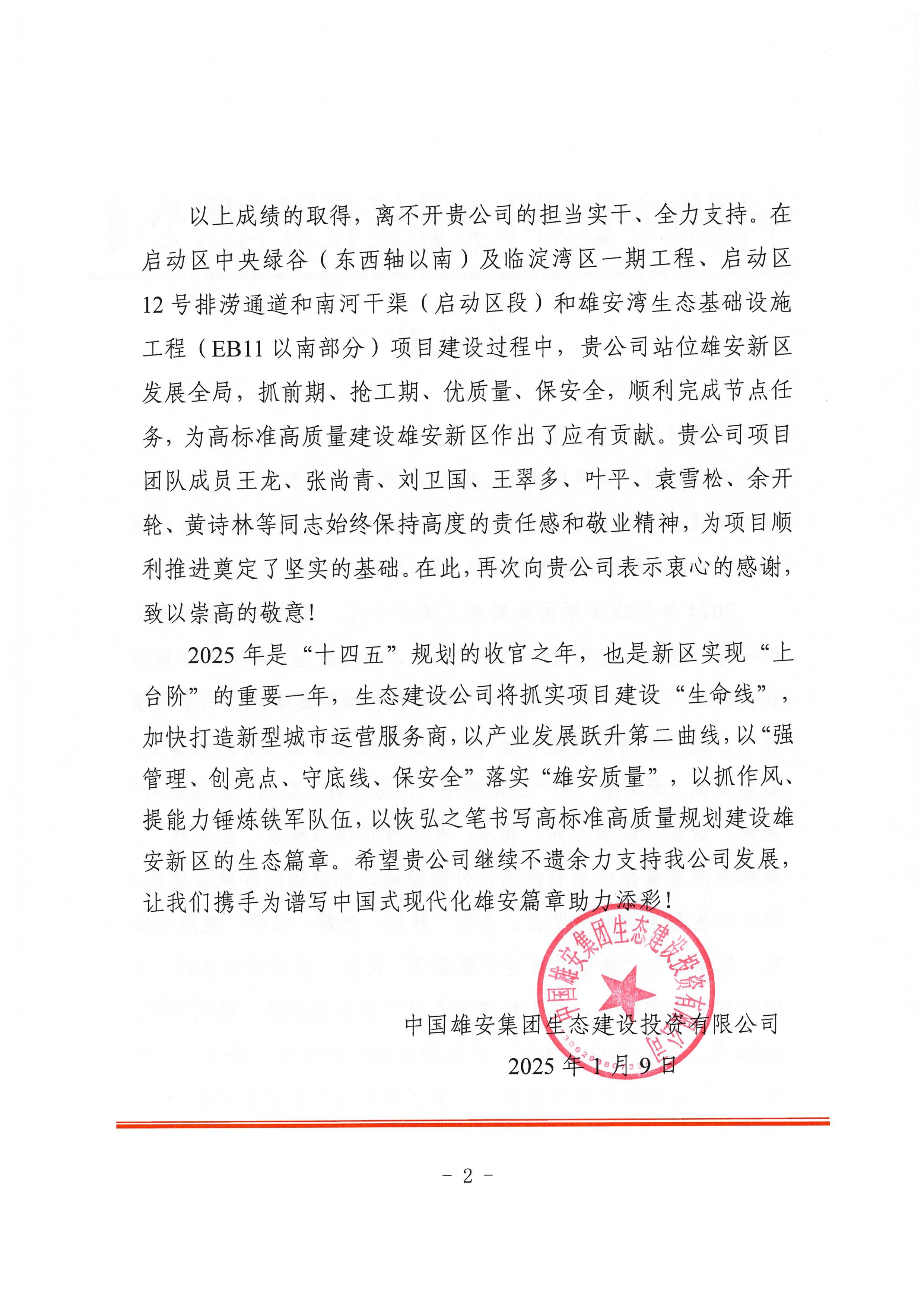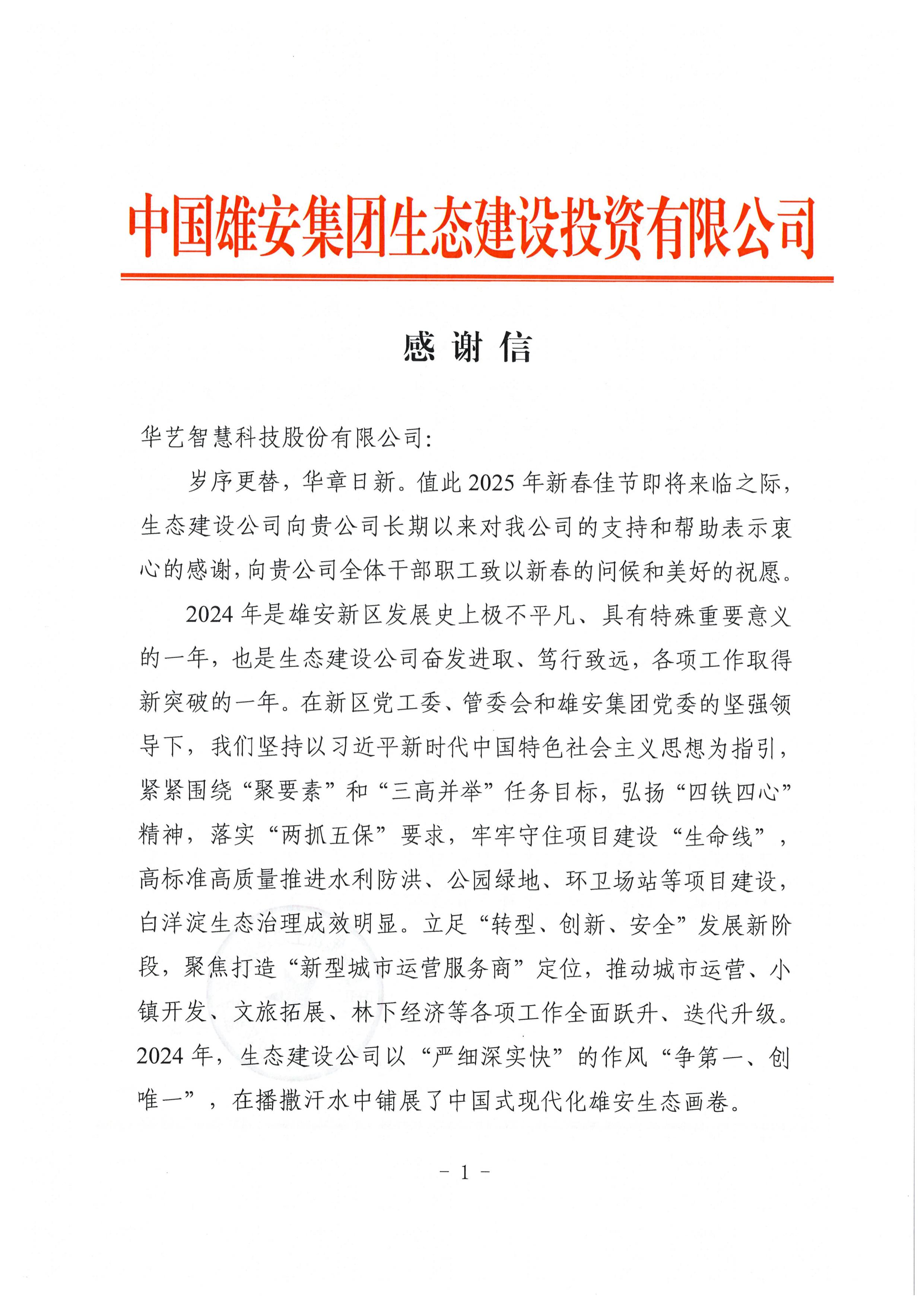 近日,華藝智慧科技股份有限公司收到來(lái)自中國(guó)雄安集團(tuán)生態(tài)建設(shè)投資有限公司發(fā)來(lái)的一封感謝信,信中對(duì)華藝智慧在啟動(dòng)區(qū)中央綠谷(東西軸以南)及臨淀灣區(qū)一期工程、啟動(dòng)區(qū)12號(hào)排澇通道和南河千渠(啟動(dòng)區(qū)段)和雄安灣生態(tài)基礎(chǔ)設(shè)施工程(EB11以南部分)項(xiàng)目營(yíng)造中“強(qiáng)管理、創(chuàng)亮點(diǎn)、守底線、保安全”落實(shí)“雄安質(zhì)量”工作給予了高度評(píng)價(jià),并對(duì)今后持續(xù)合作充滿信心和期待。